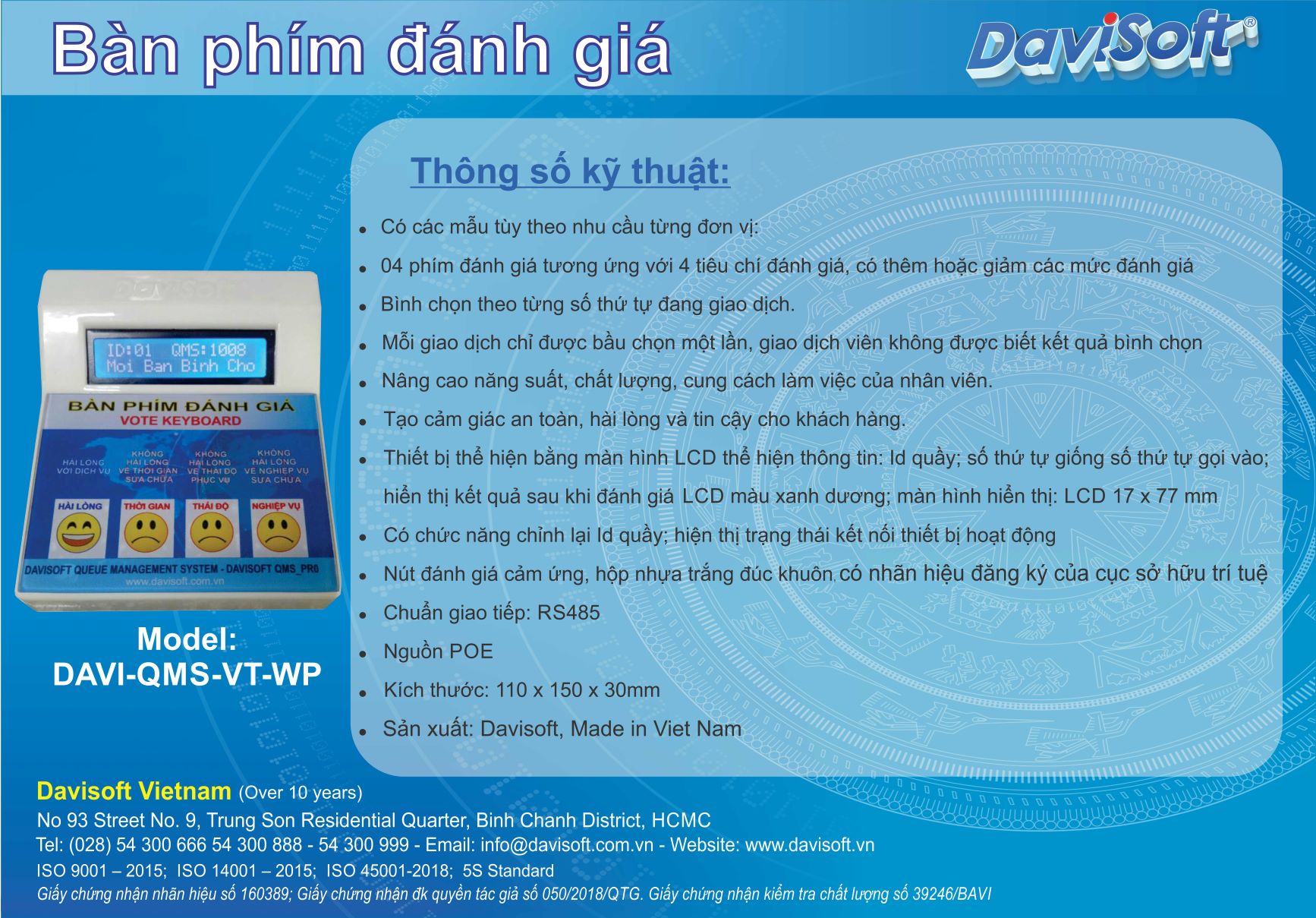 | Thiết bị thể hiện bằng màn hình LCD thể hiện thông tin: Id quầy; số thứ tự giống số thứ tự gọi vào; hiển thị kết quả sau khi đánh giá LCD màu xanh dương; màn hình hiển thị: LCD 17 x 77 mm | |