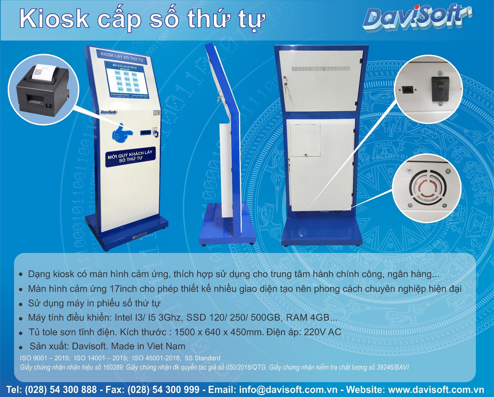 | Khung sườn chất liệu: Thép sơn tĩnh điện, chống gỉ, chống ăn mòn tốt, tạo hình và chế tạo bằng công nghệ Lazer CNC, kiểu dáng sang trọng bền bỉ, đặt biệt Kiosk chia thành 3 lớp độc lập để sơn tỉnh điện như sau: Lớp nắp mặt trước sơn tỉnh điện màu trắng, lớp thân khung sơn tỉnh điện màu xanh dương và lớp nắp mặt sau gồm có: nắp bảo vệ màn hình có khóa và bản lề nhựa 02 cái; nắp bảo vệ máy in + máy quét và bộ CPU có ổ khóa và bản lề 03 cái để đảm bảo không xệ nắp và sau tủ có nắp bật mở ngay máy in thuận lợi cho việc thay giấy in mà không cần phải mở ổ khóa nắp. | ||||