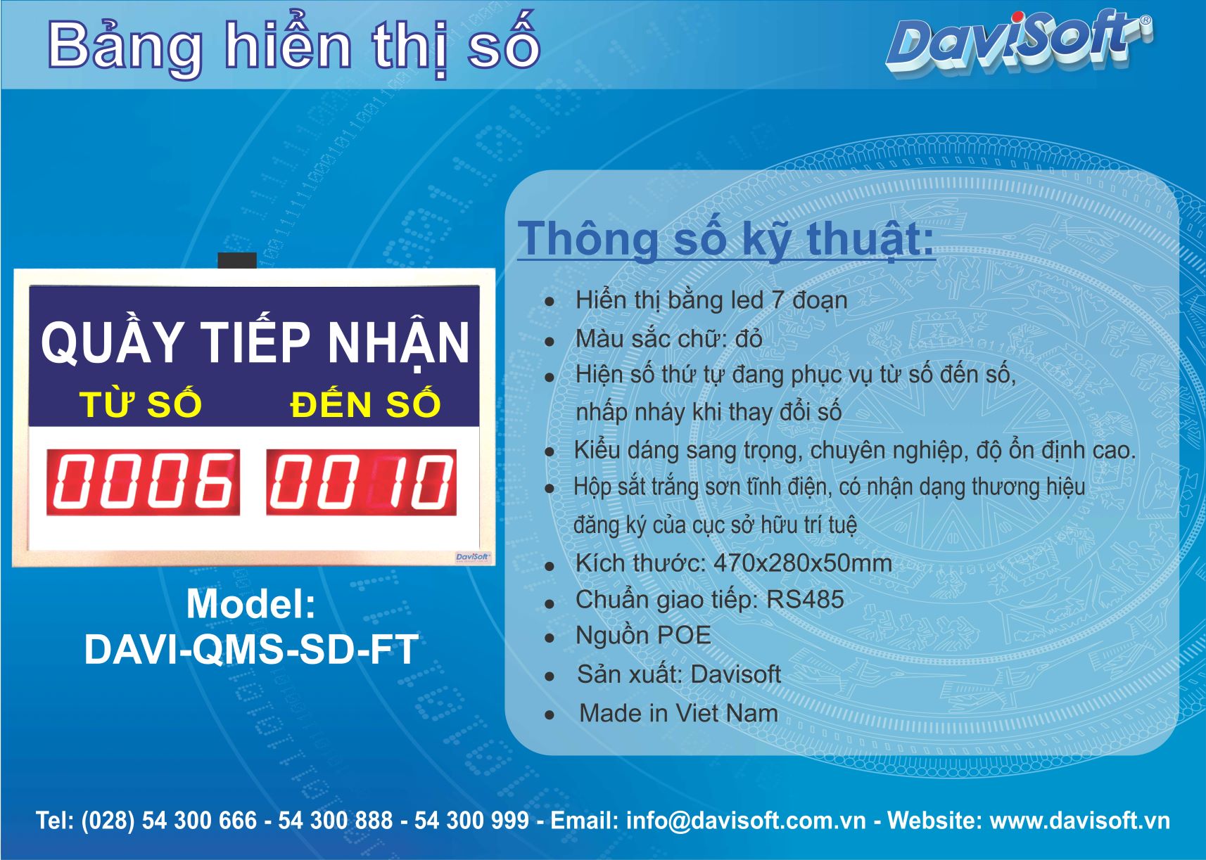 | Hiển thị số thứ tự đang phục vụ từ số đến số, nhấp nháy khi đổi số, có loa kêu tít tít (loa tích hợp bên trong thiết bị) | |