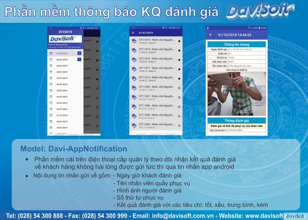 – Ngày giờ khách đánh giá – Tên nhân viên quầy phục vụ – Hình ảnh người đánh giá chụp từ máy tính bảng – Số thứ tự phục vụ – Kết quả đánh giá với các tiêu chí: tốt, xấu, trung bình, kém |